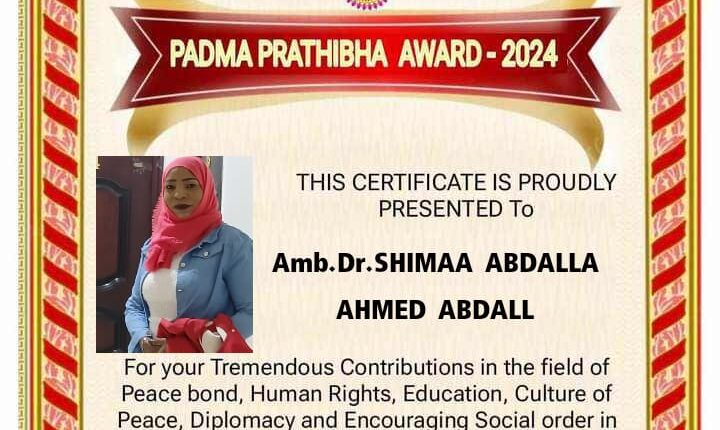 تقديراً للمجهودات في افشاء السلام ودعم العلاقات الدبلوماسية واثراء الحياة الاجتماعية والثقافية تمنح مؤسسة منام الهندية بمنطقة كادابا مقاطعة اندرا براديش جائزة (بادما) الي الاعلامية شيماء عبدالله احمد لمساهمتها في مجال حزم السلام وحقوق الانسان وثقافة السلام والدبلوماسية وتشجيع المجتمع في بلدها والمنطقة عامة وتعد جائزة بادما من ارفع الجوائز المدنية في الهند وتضم ثلاثة فئات الاولي بادما فيبهوشانالثانية بادما بهوشان الثالثة بادما شري وتمنح الجوائز في مجالات عديدة مثل الفنون والعمل الاجتماعي والشؤن العامة والاداب وغيرها وتسهم في تعزيز الحِرف والثقافات الشعبية وتشجيع عامة الناس علي الابتكار في خدمة الانسانية