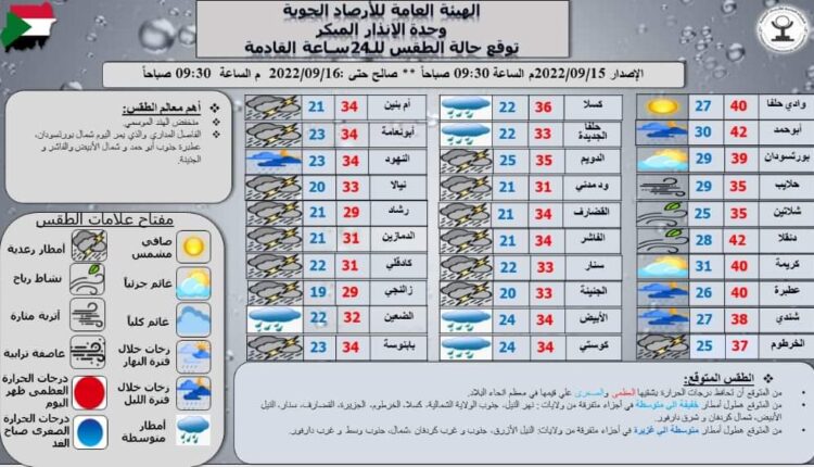 توقعت الهيئة العامة للإرصاد الجوية وحدة الإنذار اليوم، أن تحافظ درجات الحرارة بشقيها العظمى والصغرى على قيمها في معظم أنحاء البلاد خلال فترة الـ 24 ساعة المقبلة . وتوقعت وحدة الإنذار هطول أمطار متوسطة الى خفيفة في أجزاء متفرقة من ولايات نهر النيل، جنوب الولاية الشمالية، كسلا، الخرطوم، الجزيرة، القضارف، سنار، النيل الأبيض، شمال كردفان وشرق دارفور.كما توقعت هطول أمطار متوسطة إلى غزيرة في أجزاء متفرقة من ولايات النيل الأزرق، جنوب وغرب كردفان، شمال، جنوب، وسط وغرب دارفور.وأوضحت الهيئة أن من أهم معالم الطقس اليوم منخفض الهند الموسمي، الفاصل المداري والذي يمر شمال بورتسودان، عطبرة جنوب أبو حمد، شمال الأبيض ، الفاشر والجنينة.وذكرت هيئة الإرصاد أن أعلى درجة حرارة متوقعة 42 °م في كل من أبو حمد و دنقلا، وأدنى درجة حرارة متوقعة 19 °م في مدينة زالنجي، وكانت أعلى درجة حرارة سجلت ليوم أمس 42 °م في دنقلا وأدنى درجة حرارة 20 ° في مدينة الفاشر