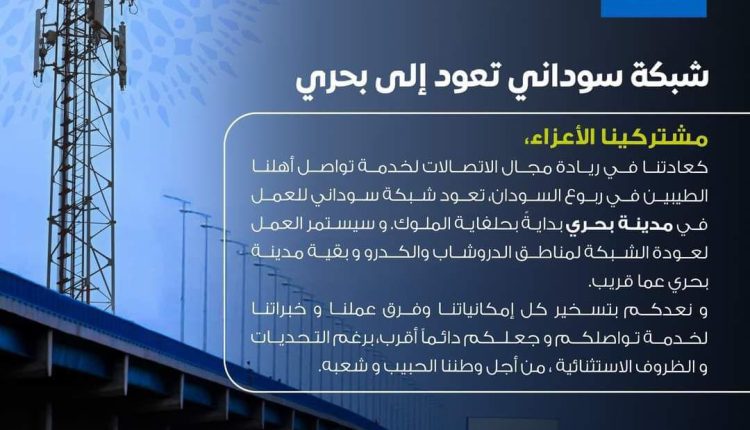 كعادتنا في ريادة مجال الاتصالات لخدمة تواصل أهلنا الطيبين في ربوع السودان، تعود شبكة Sudani للعمل في مدينة بحري بدايةً بحلفاية الملوك. و سيستمر العمل لعودة الشبكة لمناطق الدروشاب والكدرو و بقية مدينة بحري عما قريب.و نعدكم بتسخير كل إمكانياتنا وفرق عملنا و خبراتنا لخدمة تواصلكم و جعلكم دائماً أقرب، برغم التحديات و الظروف الاستثنائية، من أجل وطننا الحبيب و شعبه