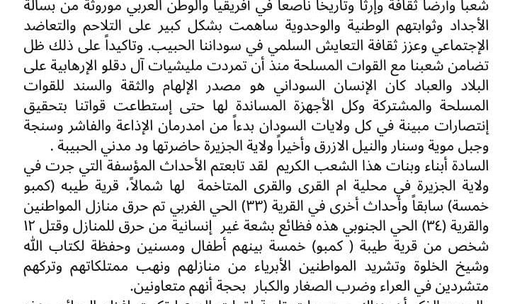 أصدر سلطان التامة ﺑﺨﺼﻮص أﺣﺪاث اﻟﻜﻨﺎﺑﻲ ﻗﺮﻳﺔ ﻃﻴﺒﺔ ﻛﻤﺒﻮ ﺧﻤﺴﺔ وتحدث في البيان مخاطبا أﻳﻬﺎ اﻟﺸﻌﺐ اﻟﺴﻮداﻧﻲ اﻷﺑﻲ اﻟﻤﺘﺮاﺑﻂ ﻓﻲ ﻣﺤﻨﺘﻪ وﺑﺴﺎﻃﺘﻪ ﻓﻲ وﻃﻦ ﺧﻠﻖ ﻓﻴﻪ اﻟﺘﻨﻮع ﻓﻲ أﻓﺮﻳﻘﻴﺎ واﻟﻮﻃﻦ اﻟﻌﺮﺑﻲ ﻣﻮروﺛﺔ ﻣﻦ ﺑﺴﺎﻟ ﻧﺎﺻﻌ وﺗﺎرﻳﺨ وإرﺛﺎ ﺛﻘﺎﻓﺔ وأرﺿﺎ ﺷﻌﺒﺎاﻷﺟﺪاد وﺛﻮاﺑﺘﻬﻢ اﻟﻮﻃﻨﻴﺔ واﻟﻮﺣﺪوﻳﺔ ﺳﺎﻫﻤﺖ ﺑﺸﻜﻞ ﻛﺒﻴﺮ ﻋﲆ اﻟﺘﻼﺣﻢ واﻟﺘﻌﺎضد ﻋﲆ ذﻟﻚ ﻇﻞاﻹﺟﺘﻤﺎﻋﻲ وﻋﺰز ﺛﻘﺎﻓﺔ اﻟﺘﻌﺎﻳﺶ اﻟﺴﻠﻤﻲ ﻓﻲ ﺳﻮداﻧﻨﺎ اﻟﺤﺒﻴﺐ. وﺗﺎﻛﻴﺪﺗﻀﺎﻣﻦ ﺷﻌﺒﻨﺎ ﻣﻊ اﻟﻘﻮات اﻟﻤﺴﻠﺤﺔ ﻣﻨﺬ أن ﺗﻤﺮدت ﻣﻠﻴﺸﻴﺎت آل دﻗﻠﻮ اﻹرﻫﺎﺑﻴﺔ ﻋﲆاﻟﺒﻼد واﻟﻌﺒﺎد ﻛﺎن اﻹﻧﺴﺎن اﻟﺴﻮداﻧﻲ ﻫﻮ ﻣﺼﺪر اﻹﻟﻬﺎم واﻟﺜﻘﺔ واﻟﺴﻨﺪ ﻟﻠﻘﻮاتاﻟﻤﺴﻠﺤﺔ واﻟﻤﺸﺘﺮﻛﺔ وﻛﻞ اﻷﺟﻬﺰة اﻟﻤﺴﺎﻧﺪة ﻟﻬﺎ ﺣﺘﻰ إﺳﺘﻄﺎﻋﺖ ﻗﻮاﺗﻨﺎ ﺑﺘﺤﻘﻴﻖ ﻣﻦ اﻣﺪرﻣﺎن اﻹذاﻋﺔ واﻟﻔﺎﺷﺮ وﺳﻨﺠًإﻧﺘﺼﺎرات ﻣﺒﻴﻨﺔ ﻓﻲ ﻛﻞ وﻻﻳﺎت اﻟﺴﻮدان ﺑﺪء. وﻻﻳﺔ اﻟﺠﺰﻳﺮة ﺣﺎﺿﺮﺗﻬﺎ ود ﻣﺪﻧﻲ اﻟﺤﺒﻴبهوﺟﺒﻞ ﻣﻮﻳﺔ وﺳﻨﺎر واﻟﻨﻴﻞ اﻻزرق وأﺧﻴﺮاﻟﺴﺎدة أﺑﻨﺎء وﺑﻨﺎت ﻫﺬا اﻟﺸﻌﺐ اﻟﻜﺮﻳﻢ ﻟﻘﺪ ﺗﺎﺑﻌﺘﻢ اﻷﺣﺪاث اﻟﻤﺆﺳﻔﺔ اﻟﺘﻲ ﺟﺮت ﻓوﻻﻳﺔ اﻟﺠﺰﻳﺮة ﻓﻲ ﻣﺤﻠﻴﺔ ام اﻟﻘﺮى واﻟﻘﺮى اﻟﻤﺘﺎﺧﻤﺔ ﻟﻬﺎ ﺷﻤﺎﻻً، ﻗﺮﻳﺔ ﻃﻴﺒﻪ )ﻛﻤﺒﻮ وأﺣﺪاث أﺧﺮى ﻓﻲ اﻟﻘﺮﻳﺔ )٣٣( اﻟﺤﻲ اﻟﻐﺮﺑﻲ ﺗﻢ ﺣﺮق ﻣﻨﺎزل اﻟﻤﻮاﻃﻨﻴﻦًﺧﻤﺴﺔ( ﺳﺎﺑﻘ١٢ واﻟﻘﺮﻳﺔ )٤٣( اﻟﺤﻲ اﻟﺠﻨﻮﺑﻲ ﻫﺬه ﻓﻈﺎﺋﻊ ﺑﺸﻌﺔ ﻏﻴﺮ إﻧﺴﺎﻧﻴﺔ ﻣﻦ ﺣﺮق ﻟﻠﻤﻨﺎزل وﻗﺘﻞﺷﺨﺺ ﻣﻦ ﻗﺮﻳﺔ ﻃﻴﺒﺔ ) ﻛﻤﺒﻮ( ﺧﻤﺴﺔ ﺑﻴﻨﻬﻢ أﻃﻔﺎل وﻣﺴﻨﻴﻦ وﺣﻔﻈﺔ ﻟﻜﺘﺎب ﷲوﺷﻴﺦ اﻟﺨﻠﻮة وﺗﺸﺮﻳﺪ اﻟﻤﻮاﻃﻨﻴﻦ اﻷﺑﺮﻳﺎء ﻣﻦ ﻣﻨﺎزﻟﻬﻢ وﻧﻬﺐ ﻣﻤﺘﻠﻜﺎﺗﻬﻢ وﺗﺮﻛﻬ.ﻣﺘﺸﺮدﻳﻦ ﻓﻲ اﻟﻌﺮاء وﺿﺮب اﻟﺼﻐﺎر واﻟﻜﺒﺎر ﺑﺤﺠﺔ أﻧﻬﻢ ﻣﺘﻌﺎوﻧﻴ اﻟﺠﺪﻳﺮ ﺑﺎﻟﺬﻛﺮ أن ﻫﻨﺎك ﻣﺠﻤﻮﻋﺎت ﺗﺎﺑﻌﺔ ﻟﻘﻮات اﻟﺪرع ارﺗﻜﺒﺖ اﻓﻈﻊ اﻟﺠﺮاﺋﻢ وﻫﺬهاﻟﻘﻮات ﺗﺘﺒﻊ ﻟﻠﻘﺎﺋﺪ ﻛﻴﻜﻞ وﻣﺠﻤﻮﻋﺎت أﺧﺮى ﻣﻦ ﻣﺴﺘﻨﻔﺮﻳﻦ وﻣﻦ اﻟﻘﺮى اﻟﻤﺠﺎورة. ﻟﻘﺮﻳﺔ ﻃﻴﺒﺔ وﻫﻲ اﻟﻤﻐﺎرﺑوﻧﺤﻦ إذ ﻧﺪﻳﻦ وﻧﺸﺠﺐ وﻧﺴﺘﻨﻜﺮ ﻟﻤﺜﻞ ﻫﺬا اﻟﺴﻠﻮك اﻟﻬﻤﺠﻲ اﻟﺒﺮﺑﺮي اﻟﻤﺸﻴ.ﻟﻸﻋﺮاف اﻟﺪﻳﻨﻴﺔ واﻹﺳﻼﻣﻴﺔ و اﻟﻘﺎﻧﻮﻧﻴﺔ وﻻ ﺗﺸﺒﻪ ﻗﻴﻢ وأﺧﻼﻗﻨﺎ ﻧﺤﻦ اﻟﺴﻮداﻧﻴ وﺳﻼﻣﺎ ﻟﺤﻘﻦ اﻟﺪﻣﺎء ووﻗﻒ إزﻫﺎقوﻧﺮﺣﺐ ﻟﺒﻴﺎن اﻟﻘﻮات اﻟﻤﺴﻠﺤﺔ اﻟﺘﻲ ﺟﺎء ﺑﺮد .اﻷرواح اﻟﺒﺮﻳﺌﺔ ﻟﻠﺘﺠﺎوزات اﻟﺘﻲ وﻗﻌﺖ ووﻋﺪت ﺑﺎﻹﻟﺘﺰام واﻟﻤﺤﺎﺳﺒﺔ ﻋﲆ ﻣﻦ ﻳﺠﺮم اﻟﻜﻨﺎﺑورﻓﻀﺎ -:وﻗﺮى اﻟﺠﺰﻳﺮة و ﻋﻠﻴﻪ ﻧﻄﺎﻟﺐ ﺑﺎﻻﺗﻲ1/ ﻋﲆ اﻟﺴﻠﻄﺎت ﻓﻲ اﻟﻘﻮات اﻟﻤﺴﻠﺤﺔ واﻷﺟﻬﺰة اﻻﻣﻨﻴﺔ ﻣﺤﺎﺳﺒﺔ اﻷﻓﺮاد اﻟﺬﻳﻦارﺗﻜﺒﻮا اﻟﻔﻈﺎﺋﻊ واﻟﻘﺒﺾ ﻋﲆ اﻟﺠﻨﺎة وﺗﻘﺪﻳﻤﻬﻢ ﻟﻤﺤﻜﺎﻣﺎت ﻋﺎدﻟﺔ ﺣﺘﻰ ﻻ ﻳﻔﻠﺖ اي. ﻣﺠﺮم ﻣﻦ اﻟﻌﻘﺎب. 2/ ﺗﻜﻮﻳﻦ ﻟﺠﻨﺔ ﻗﺎﻧﻮﻧﻴﺔ ذات ﻛﻔﺎءة وﻣﺴﺘﻘﻠﺔ ﻟﻠﺘﺤﻘﻴﻖ ﺣﻮل ﻫﺬه اﻷﺣﺪاث3/ اﻟﻤﺘﻌﺎوﻧﻴﻦ واﻟﺸﻔﺸﺎﻓﺔ واﻟﻤﺠﺮﻣﻴﻦ واﻟﻤﻨﺘﺴﺒﻴﻦ ﻟﻠﻤﻠﻴﺸﻴﺎت ﻻ ﻣﻜﺎن ﻟﻬﻢ ﺑﻴ.اﻟﻜﻨﺎﺑﻲ واﻟﻘﺮى و اﻟﻤﺠﺘﻤﻌﺎت وﺳﺘﻼﺣﻘﻬﻢ اﻟﻤﺤﺎﺳﺒﺔ وﺗﻄﺒﻖ ﻋﻠﻴﻬﻢ اﻟﻘﺎﻧﻮن4/ ﻋﲆ اﻟﻨﻈﺎر واﻹدارات اﻻﻫﻠﻴﺔ واﻟﻤﺠﺘﻤﻊ اﻟﻤﺪﻧﻲ ﺑﻮﻻﻳﺔ اﻟﺠﺰﻳﺮة وﻛﻞ اﻹدارة اﻷﻫﻠﻴﺑﺎﻟﺴﻮدان اﻟﺘﺪﺧﻞ اﻟﻌﺎﺟﻞ وﻣﻌﺎﻟﺠﺔ ﻣﺜﻞ ﻫﺬه اﻟﺘﺼﺮﻓﺎت واﻟﺴﻠﻮك اﻟﻼ أﺧﻼﻗﻲ.وﺗﻔﻮﻳﺖ اﻟﻔﺮﺻﺔ ﻋﲆ اﻟﻤﺘﺮﺑﺼﻴﻦ5/ ﻋﲆ اﻟﻘﺎﺋﺪ ﻛﻴﻜﻞ ﺑﺄن ﻳﻀﺒﻂ ﻗﻮاﺗﻪ ﺑﻌﺪم ﺗﻜﺮار ﻣﺜﻞ ﻫﺬه اﻟﺘﺼﺮﻓﺎت ﻓﻲ ﺣﻖ وﻟﺪﻳﻨﺎ اﻷدﻟﺔ ﺑﺘﻮرط ﻗﻮات وﺗﺼﻔﻴﺘﻬﻢ اﻧﺘﻘﺎﻣ اﻟﻤﻮاﻃﻨﻴﻦ اﻟﻌﺰل واﻋﺘﻘﺎﻟﻬﻢ ﺗﻌﺴﻔﻴ.اﻟﺪرع ﻓﻲ ﻫﺬه اﻷﺣﺪاث وﻏﻴﺮﻫﺎ6/ ﻧﻨﺎﺷﺪاﻟﻌﻘﻼء ﻣﻦ أﺑﻨﺎء اﻟﻘﺮي واﻟﻜﻨﺎﺑﻲ ﺑﺎﻟﻮﻻﻳﺔ ﺿﺒﻂ اﻟﻨﻔﺲ وﻧﺒﺬ اﻟﻘﺒﻠﻴﺔ واﻟﺘﻔﺮﻗاﻹﺟﺘﻤﺎﻋﻴﺔ وﺧ
