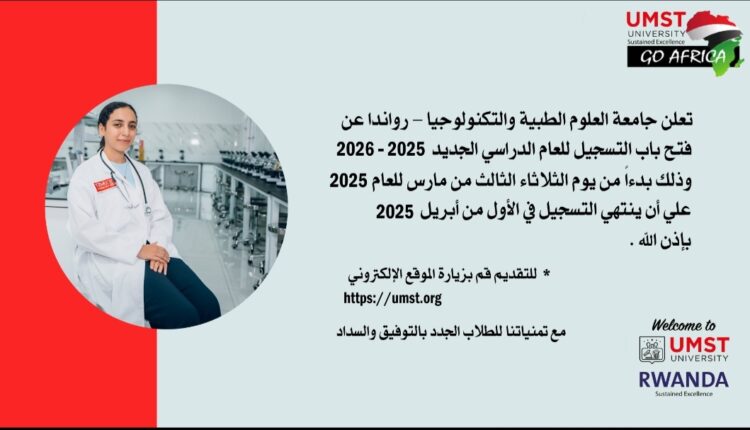 تعلن جامعة العلوم الطبية والتكنولوجيا – رواندا عن فتح باب التسجيل للعام الدراسي الجديد 2025 _2026 وذلك بدءاً من يوم الثلاثاء الثالث من مارس للعام 2025 ، على أن ينتهي التسجيل في الأول من أبريل 2025 بإذن الله … للتقديم قم بزيارة الموقع الإلكتروني 👇https://umst.orgمع تمنياتنا للطلاب الجدد بالتوفيق والسداد