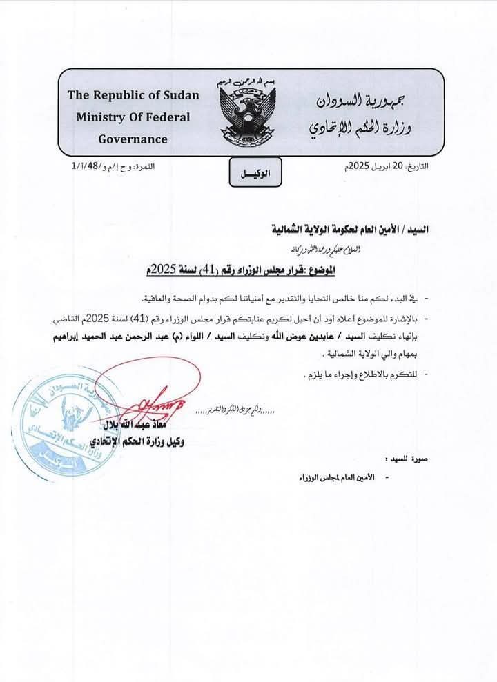 تمت إقالة والي الولاية الشمالية رسميًا، في خطوة تأتي ضمن مراجعات الحكومة لأداء حكومات الولايات.