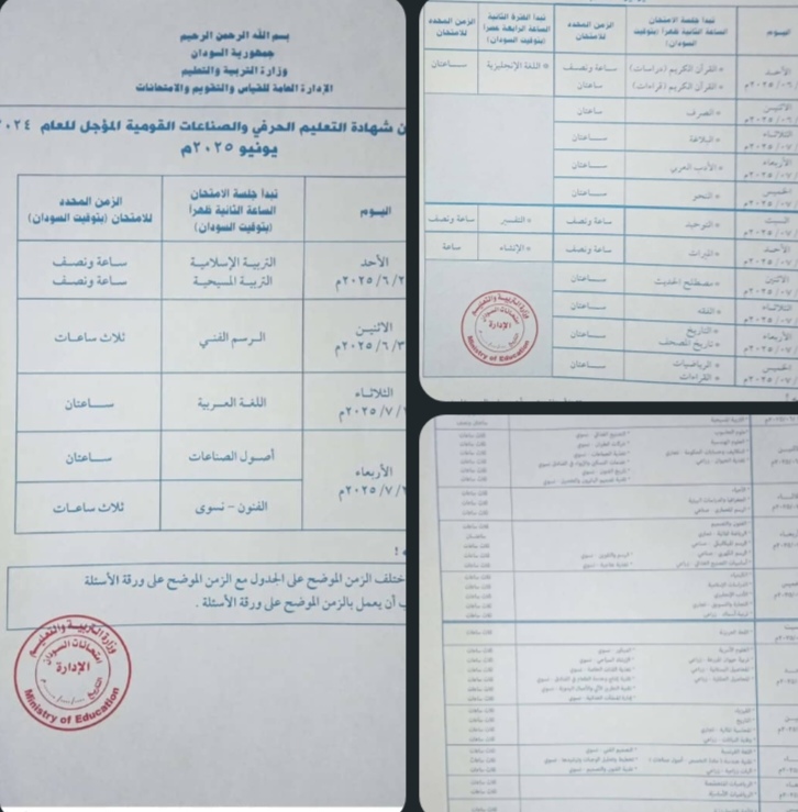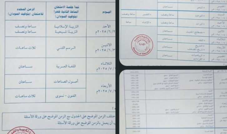 وقال د. معتصم علي الشيخ مدير الادارة العامة لامتحانات السودان ان الادارة اصدرت جداول الامتحانات للشهادات ( الاكاديمية ،الفنية،الاهلية وشهادة التعليم الحرفي) ، مشيرا الى ان الامتحانات ستبدأ يوم الاحد الموافق 29/ 6 /2025م بمادتي التربية الاسلامية والتربية المسيحية ، وتنتهي في يوم الخميس 10/ 7/ 2025م بمادة اللغة الانجليزية مبينا ان الامتحان يبدأ في تمام الساعة الثانية بعد الظهر بتوقيت السودان في جميع المراكز داخل السودان وخارجه .