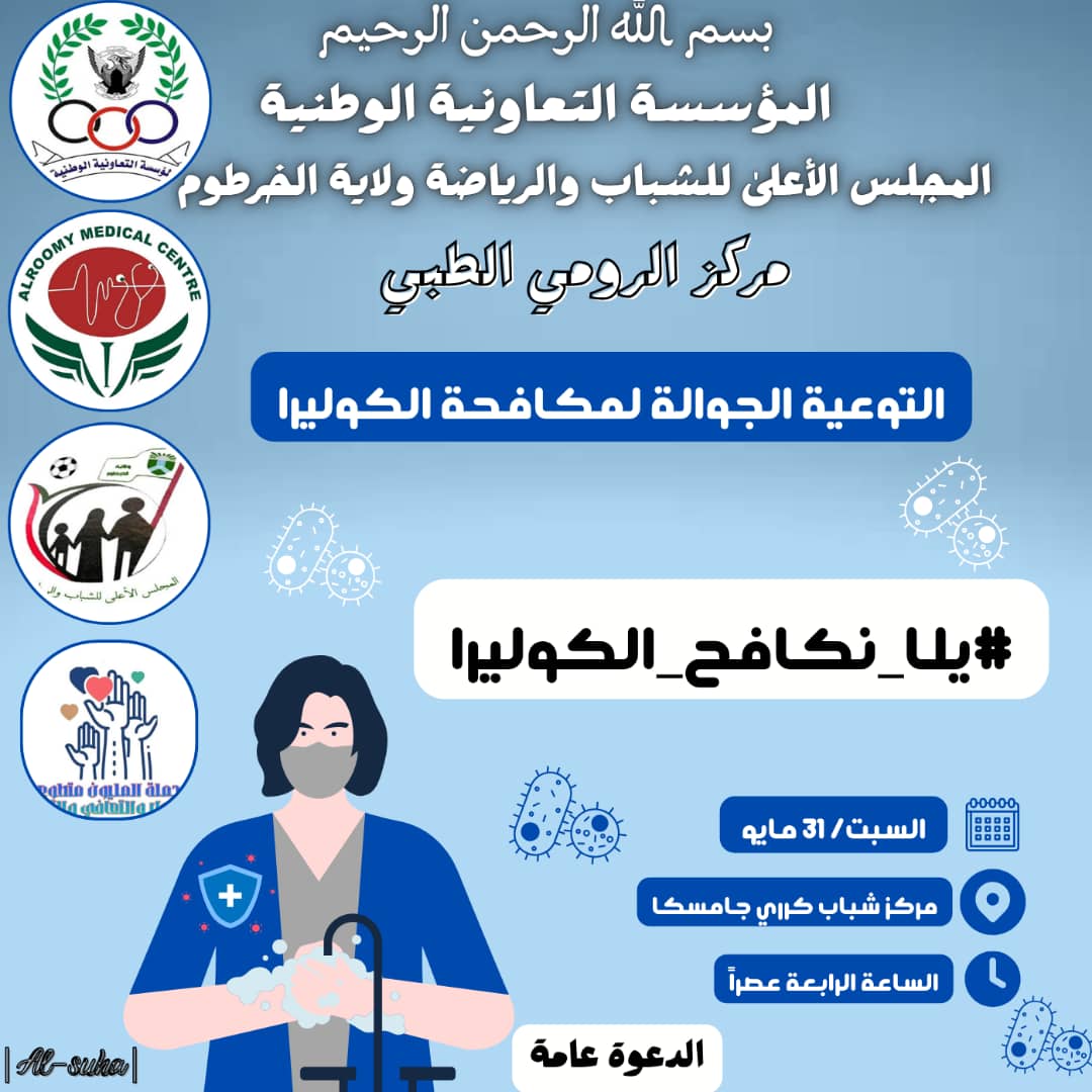 تدشن المؤسسة التعاونية الوطنية بالتعاون مع المجلس الأعلى للشباب والرياضة بولاية الخرطوم برامج التوعية من الكوليرا بشراكة مع حملة المليون متطوع للإعمار والتعافي والتنمية ومركز الرومي الطبي غدا السبت في مركز شباب كرري جامسكا الساعة 4 عصرا