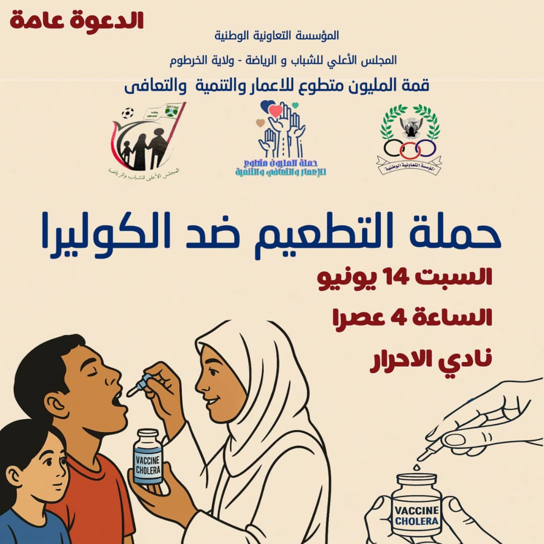 تقيم المؤسسة التعاونية الوطنية التابعة للقوات المسلحة بالتعاون مع حملة المليون متطوع حملة التطعيم ضد الكوليرا وذلك في نادي الأحرار ب بالحارة السادسة بأم درمان في الرابعه عصرا اليوم السبت 14 يونيو 2025 م