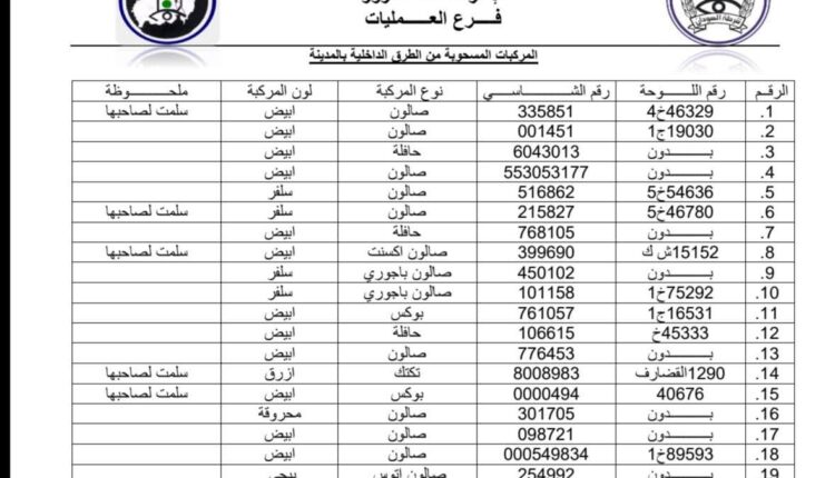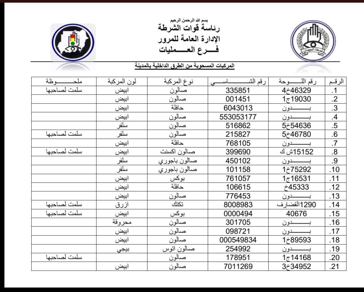 تُعلن إدارة مرور ولاية الجزيرة عن وجود عدد (400) مركبة تم سحبها وهي حالياً بحوش المرور التابع للولاية.نرجو من السادة المواطنين المعنيين الاطلاع على الكشوفات المرفقة والتكرم بالحضور إلى إدارة المرور لاستلام مركباتهم، وذلك بعد إبراز المستندات الرسمية المطلوبة.كما نلفت انتباه المواطنين الكرام بأنه في حال وُجدت نشرة جنائية على أي شخص فعليه مراجعة المباحث المركزية أو التوجه إلى مباني النيابة لاستكمال الإجراءات القانونية وقفل البلاغ المفتوح قبل استلام المركبة._ للاطلاع على الكشوفات يرجى مراجعة القائمة المرفقة مع هذا التنويه.ولكم فائق الشكر والتقدير،إدارة مرور ولاية الجزيرة
