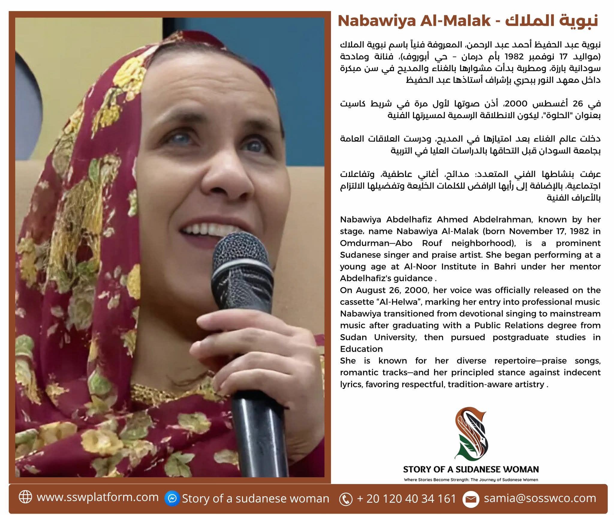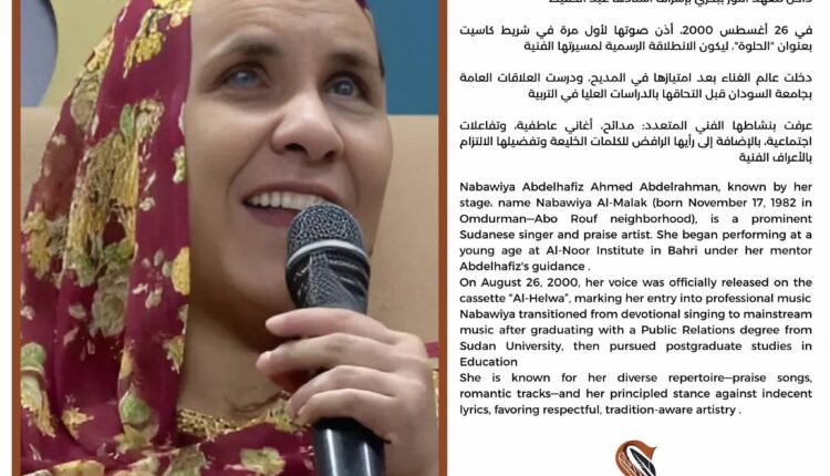 Nabawiya Abdelhafiz Ahmed Abdelrahman, known by her stage name Nabawiya Al-Malak (born November 17, 1982 in Omdurman—Abo Rouf neighborhood), is a prominent Sudanese singer and praise artist. She began performing at a young age at Al-Noor Institute in Bahri under her mentor Abdelhafiz’s guidance .