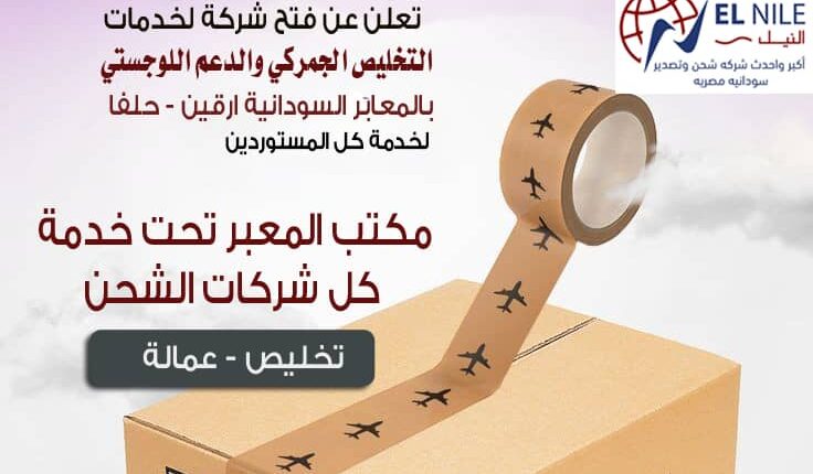 تعلن شركة النيل للشحن والتصدير عن فتح شركة لخدمات التخليص الجمركي والدعم اللوجستي بالمعابر السودانية أرقين.. حلفا وهي خدمة تقدمها لكل المستوردين وتعتبر شركة النيل اكبر وأحدث شركة شحن وتصدير سودانية