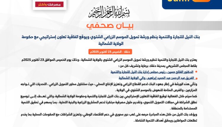 وسيتم خلال الورشة توقيع اتفاقية التعاون الإستراتيجي بين بنك النيل للتجارة والتنمية وحكومة الولاية الشمالية، وتهدف إلى توسيع نطاق الشراكة في مجالات التمويل التنموي، وتقديم حلول مصرفية مبتكرة لدعم المشاريع الزراعية والبنية التحتية، بما يسهم في تحقيق التنمية المستدامة بالمنطقة.