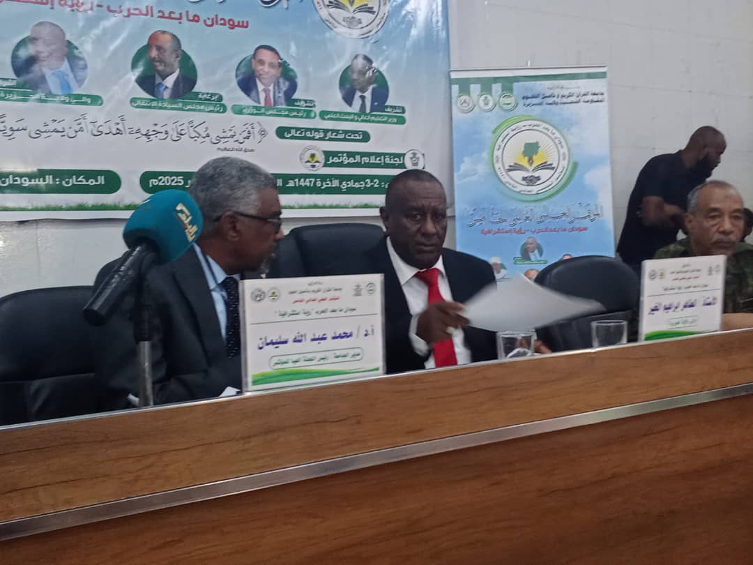 من جانبه إستعرض البروفيسور محمد عبد الله سليمان مدير جامعة القران الكريم وتأصيل العلوم مراحل نشأة الجامعة والآفاق التي إرتادتها عبر 14 كلية منتشرة في كل المحليات وعدد من المراكز العلمية لخدمة المجتمع متناولا النهب والتدمير الممنهج الذي تعرضت له الجامعة من قبل مليشيا أسرة دقلو الإرهابية والذي بلغت كلفته 15 مليون دولار معدداً الجهود إدارته لإعمار الجامعة عبر عدة لجان بدعم مقدر من المجتمع الداخلي والخارجي وأشار لأهداف المؤتمر الرامية لتعزيز دور البحث العلمي لمعالجة جذور الأزمة الوطنية وكافة المشاكل والقضايا التي أفرزتها الحرب ..