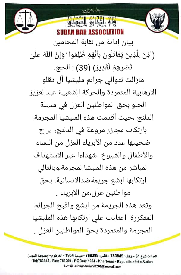 عليه تدين نقابة المحامين السودانيين باشد العبارات هذا المسلك الاجرامي البغيض المخالف للقانون الدولي الانساني ، وتهيب دول العالم اجمع وهيئاته ومنظماته القيام بمسئولياتهم تجاه استهداف المواطنين العزل من قبل هذه المليشيات المتمردة ، و ان تقوم علي وجه السرعة بادانة هذه الجرائم المتكررة بحق المدنيين السودانيين العزل، وتطالب نقابة المحامين السودانيين بايقاف هذه الجرائم والمجازر البشعة علي وجه السرعة ،و تقديم قادة هذه المليشيا المتمردة المجرمة وأتباعها السياسيين، ومعاونيها من الدول والمنظمات لمحاكمات عاجلة لارتكابهم جرائم الابادة الجماعية والاغتصاب والسرقة والنهب والتهجير القسري وغيرها من الجرائم الخطيرة .