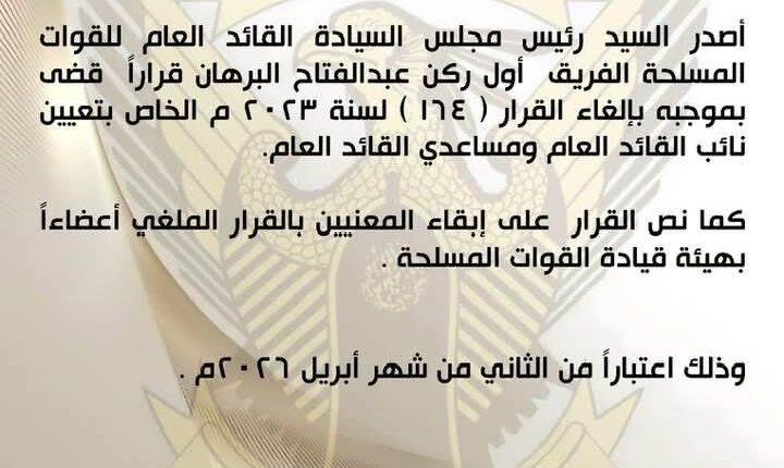 البرهان يصدر تعيينات جديدة بخصوص ياسر العطا والكباشي وإبراهيم جابر
