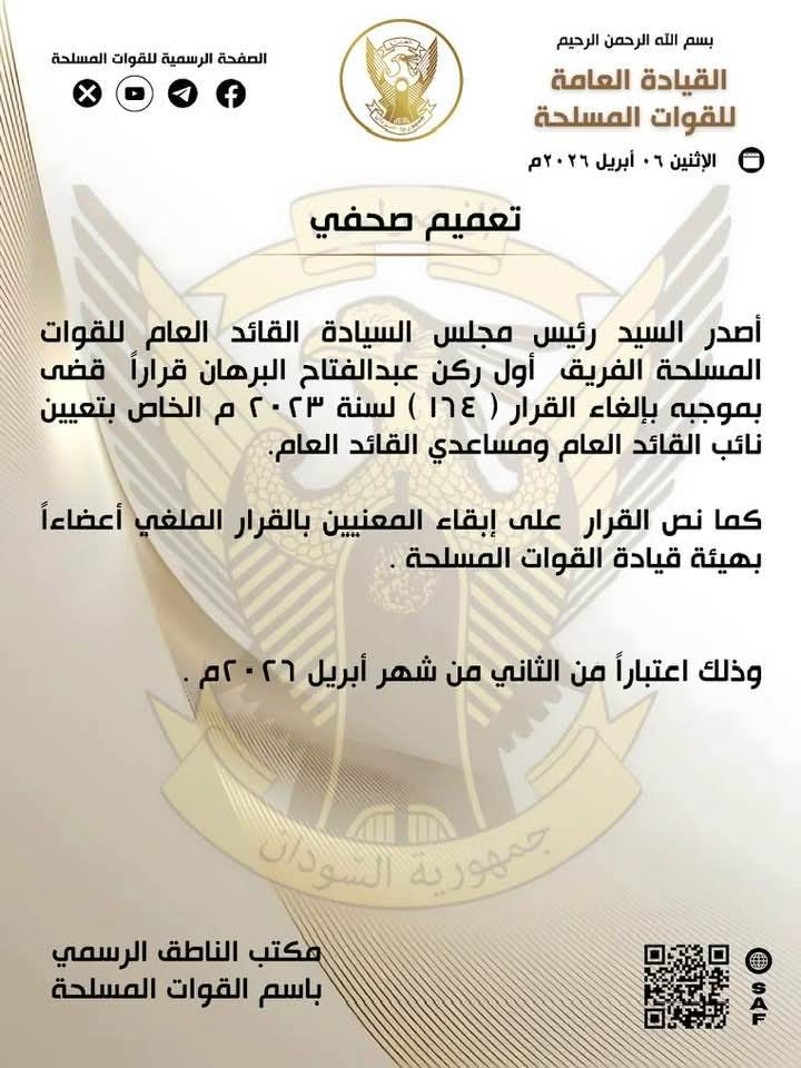 أصدر رئيس مجلس السيادة الانتقالي الفريق أول ركن عبدالفتاح البرهان أمرا بتعيين الفريق أول ركن شمس الدين كباشي مساعداً لشئون البناء والتخطيط الاستراتيجي.. والفريق ركن بحري إبراهيم جابر مساعداً لشئون العلاقات الدولية والتعاون العسكري..و الفريق أول ميرغني إدريس مساعدا لشئون الصناعات الدفاعية.. واللواء حقوقي ايهاب محمد حسين مديراً للقضاء العسكري.