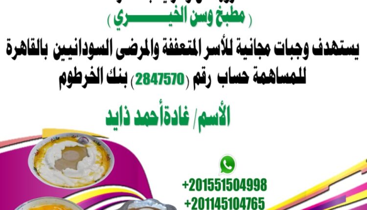 🫵مانقص مال من صدقة 🤲 فكره نبعت🧏♂️👩👩👦👦 من بعض الاخوه في القاهره وعلى رأسهم ام وسن ونسالكم الدعاء🙏 لابنتها وسن اتفقنا على توفير وجبات🍛 مجانيه للمرضى والأسر المتعففه😢 المقيمين في مصر. ونحن نجهز في معدات المطبخ🍽️ حدثتنا سيده سودانيه بأن هناك سيده سودانيه يمر عليها يوم كامل دون اكل😭.. ولذالك نفتح الباب المساهمات العيينه🙋♂️. والنقديه💸.. ومعا نسد بعض حوجات إخوتنا المقيمين في القاهرة🤲 للمساهمه حساب 2847570 بنك الخرطوم بأسم غادة احد ذايد كما ندعو الشباب بارض اللواء للتطوع بتوزيع الوجبات للمستهدفين
