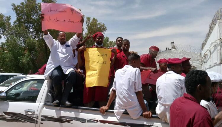 وهتف العمال الذين تجمعوا في موقف تضامني ضد سلطة محلية الخرطوم ورفعوا لافتات منددين بالقرار الذي وصفوه بالظالم