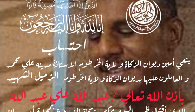 ( ولنبلونكم بشئ من الخوف والجوع ونقص من الاموال والانفس والثمرات وبشر الصابرين ،الذين اذا أصابتهم مصيبة قالوا إنا لله وانا اليه راجعون ،أولئك عليهم صلوات من ربهم ورحمة وأولئك هم المهتدون ) تحتسب الاستاذة مدينه علي محمد امين ديوان الزكاة ولاية الخرطوم والعاملون الزميل الشهيد عبد الله على عبدااله ،بمكتب الزروع بمحلية امدرمان الذى استشهد اثر اصابته بطلق نارى،عرف الفقيد بين زملائه بدماثة الاخلاق وبطيب الخصال والتواضع ،،ونسال الله ان ينزله الفردوس الاعلى مع الصديقين والشهداء والصالحين وحسن أؤلئك رفيقا ،